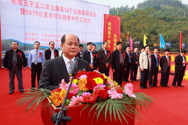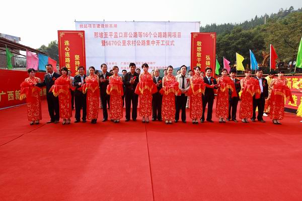 為貫徹落實自治區(qū)黨委、政府在全區(qū)掀起項目建設新高潮的決策部署,沖刺第四季度,完成全年公路建設目標任務,自治區(qū)交通運輸廳于11月3日舉行全區(qū)公路路網(wǎng)改造項目集中開工儀式。由集團公司承辦的分會場——那坡至平孟口岸公路等16個公路路網(wǎng)項目暨5670公里農(nóng)村公路集中開工儀式在百色市那坡縣德隆鄉(xiāng)隆重舉行。自治區(qū)交通運輸廳紀檢組長、廳黨組成員朱名勝,百色市市委常委、政法委書記周武紅,市人大常委會黨組成員黃五同,集團公司黨委書記、董事長朱堅和、總經(jīng)理李定倫、黨委副書記張友坐、副總經(jīng)理劉明洪、總工程師覃炳賢,自治區(qū)公路管理局、百色市公路管理局、交通運輸局、那坡縣四家班子、集團公司直屬各單位領導及有關部門負責人等出席開工儀式。