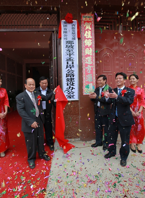 自治區(qū)交通運輸廳紀檢組長、廳黨組成員朱名勝(左一)、集團公司董事長朱堅和(右二)等領導為項目建設辦公室揭牌