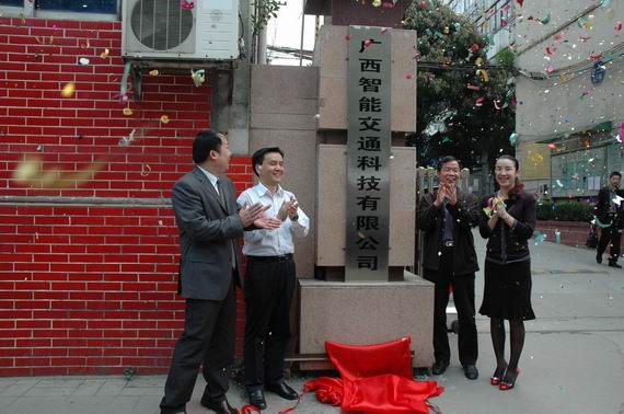 圖為:自治區(qū)交通運輸廳副巡視員符茂清(右二),集團公司副總經(jīng)理劉明洪(左二)為廣西智能交通科技有限公司成立揭牌