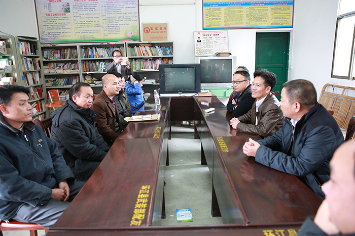 集團(tuán)公司朱堅(jiān)和董事長(zhǎng)(左三)、張友坐副書記(右一)聽取駐村”第一書記“梁義寬匯報(bào)工作。 在相堯村、豹山村、才帛村,朱堅(jiān)和董事長(zhǎng)分別與當(dāng)?shù)劓?zhèn)、村干部以及覃獻(xiàn)康、梁義寬、蔣博三位派駐農(nóng)村“第一書記”和扶貧工作隊(duì)隊(duì)員進(jìn)行親切交談,詳細(xì)詢問“第一書記”工作、生活情況,并聽取了“第一書記”關(guān)于幫扶村的黨建及村集體經(jīng)濟(jì)發(fā)展情況匯報(bào)。得知目前各駐村書記及扶貧工作隊(duì)員已經(jīng)完成精準(zhǔn)扶貧入戶摸底調(diào)查時(shí),朱堅(jiān)和董事長(zhǎng)對(duì)“第一書記”到村以來,深入調(diào)查走訪,積極幫助村里理思路、定規(guī)劃、辦實(shí)事,表示充分肯定。