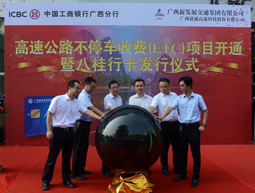 8月25日上午,中國工商銀行廣西分行與集團公司舉行高速公路不停車收費(ETC)項目開通暨八桂行卡發(fā)行儀式,標志著工行ETC業(yè)務(wù)在廣西正式啟動。集團公司董事、副總經(jīng)理劉明洪,工行廣西區(qū)分行副行長楊永等領(lǐng)導出席儀式并致辭。