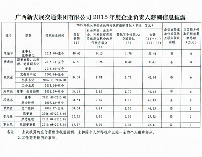 廣西新發(fā)展交通集團有限公司2015年度企業(yè)負(fù)責(zé)人薪酬信息披露