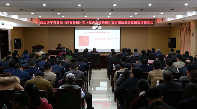 2017年2月24日上午,自治區(qū)學(xué)習(xí)貫徹《中國(guó)共產(chǎn)黨問(wèn)責(zé)條例》《中國(guó)共產(chǎn)黨黨內(nèi)監(jiān)督條例》宣講團(tuán)到集團(tuán)公司舉行宣講報(bào)告會(huì),自治區(qū)紀(jì)委宣傳部部長(zhǎng)陳柳青作宣講報(bào)告,集團(tuán)公司黨委副書記、副董事長(zhǎng)、總經(jīng)理唐咸秋主持會(huì)議。