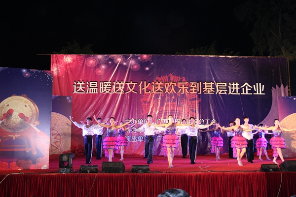 晚上,自治區(qū)總工會安排了豐富多彩的慰問演出。整場演出以“勞動托起中國夢”為主題,載歌載舞,奏響勞動光榮的時代主旋律。慰問演出在富有壯族文化風(fēng)情的《廣西尼的呀》的舞蹈中拉開了序幕,既有《力與美》的高難度雜技表演,又有詼諧幽默、勵志感人的小品《為愛加油》,配樂詩朗誦《心儀廣西》展示了廣西壯鄉(xiāng)的山好水好前景闊,更有優(yōu)美的舞蹈《魅影》、《工匠精神》等節(jié)目更是歌頌了勞動之美。路橋集團(tuán)員工還帶來配樂詩朗誦《萬里征程品為本,行穩(wěn)致遠(yuǎn)前景闊》和小品《工地愛情故事》,展現(xiàn)了路橋職工的風(fēng)采。慰問演出在歌舞《不忘初心》中畫上了圓滿的句號,路橋建設(shè)者們在這場文化盛宴中度過一個難忘的夜晚。