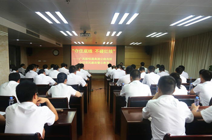 活動(dòng)上,新恒通公司黨委書(shū)記、董事長(zhǎng)賴水平還對(duì)與會(huì)人員進(jìn)行了廉政集體約談。賴水平感謝吳雄飛老師給大家上了一堂別開(kāi)生面的廉政警示教育課,作為交通基礎(chǔ)設(shè)施建設(shè)行業(yè)的業(yè)主單位,在廉潔從業(yè)的道路上,他提出幾點(diǎn)要求和期望:一是加強(qiáng)學(xué)習(xí),提升道德修養(yǎng),堅(jiān)定理想信念;二是嚴(yán)于律己,規(guī)范作風(fēng)行為,筑牢防腐堤壩;三是嚴(yán)以用權(quán),增強(qiáng)廉政意識(shí),緊守從業(yè)底線;四是守土有責(zé),堅(jiān)持“一崗雙責(zé)”,深化責(zé)任落實(shí)。賴水平強(qiáng)調(diào),廣西交通基礎(chǔ)設(shè)施建設(shè)正處于大有可為、大有作為的歷史機(jī)遇期,面對(duì)紛繁復(fù)雜的形勢(shì),全體黨員干部要在黨的十九大精神的指引下,緊緊圍繞公司總體工作思路和目標(biāo),統(tǒng)一思想,堅(jiān)定信念,持續(xù)加強(qiáng)作風(fēng)建設(shè),堅(jiān)決把紀(jì)律挺在前面,耳邊常響廉潔警鐘,心中常筑反腐防線,用廉潔從業(yè)的實(shí)際行動(dòng)為公司“縣縣通”高速公路建設(shè)事業(yè)的發(fā)展保駕護(hù)航。