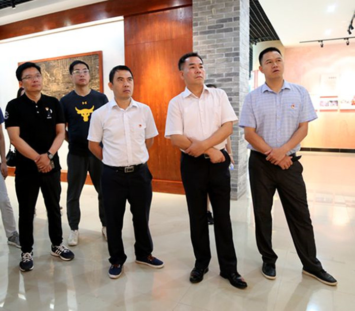 圖一:集團公司紀(jì)委書記韋慶和(右二)、新恒通公司黨委書記賴水平(右一)帶隊參觀于成龍廉政文化展示館