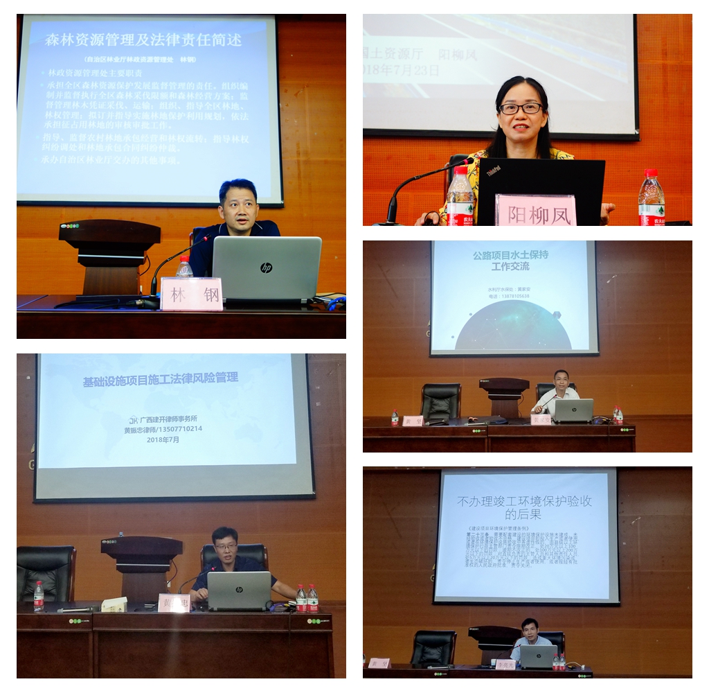 此次培訓(xùn)邀請了自治區(qū)國土資源廳規(guī)劃處副處長陽柳鳳、林業(yè)廳林政處副處長林鋼、環(huán)境保護(hù)廳環(huán)評處處長李亮光、水利廳水土保持處副處長黃家安以及廣西建開律師事務(wù)所主任黃振忠律師5位專家圍繞項目建設(shè)過程中的國土、林地、環(huán)境保護(hù)、水土保持以及項目經(jīng)營常見法律政策問題進(jìn)行專題授課。此次培訓(xùn)緊貼建設(shè)項目管理的實際需求,內(nèi)容豐富,針對性強(qiáng)。通過培訓(xùn),提高了廣大建設(shè)項目管理人員的法律政策水平,增強(qiáng)了處理具體法律問題的能力,對今后依法依規(guī)建設(shè)項目起到很好的促進(jìn)作用。