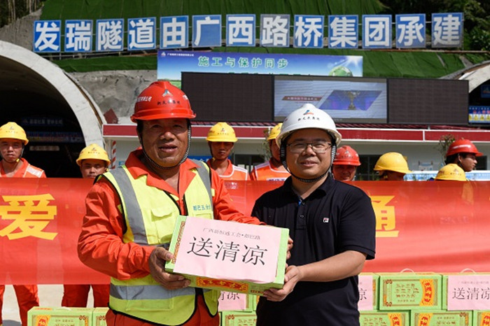 8月14-15日,新恒通公司黨委副書記、副董事長、總經(jīng)理、總工程師藍日彥,公司黨委委員、常務副總經(jīng)理蘇偉勝,公司黨委委員、副總經(jīng)理、都巴高速指揮部黨支部書記、指揮長陸原恩一行到都巴高速五分部發(fā)瑞隧道出口、三分部紅水河特大橋施工現(xiàn)場,深入施工一線慰問都巴高速六個分部的一線工人,為他們送去了防暑降溫慰問品,表達了對一線工人的關(guān)懷,感謝他們炎炎夏日下的堅守。