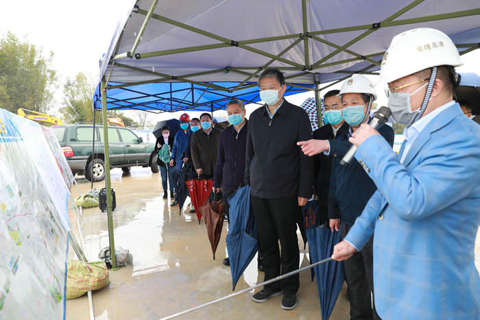 自治區(qū)副主席費(fèi)志榮(右四)到吳隆路施工現(xiàn)場調(diào)研交通項目復(fù)工建設(shè)情況