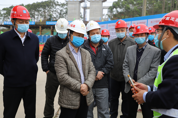3月5日,自治區(qū)交通運(yùn)輸廳副廳長(zhǎng)王劼耘到大塘至浦北高速公路項(xiàng)目開展防疫及復(fù)工復(fù)產(chǎn)工作情況調(diào)研。自治區(qū)交通工程質(zhì)量安全監(jiān)督站站長(zhǎng)陳津維、自治區(qū)高速公路發(fā)展中心主任周北、欽州市政府副秘書長(zhǎng)黃立和一同調(diào)研。